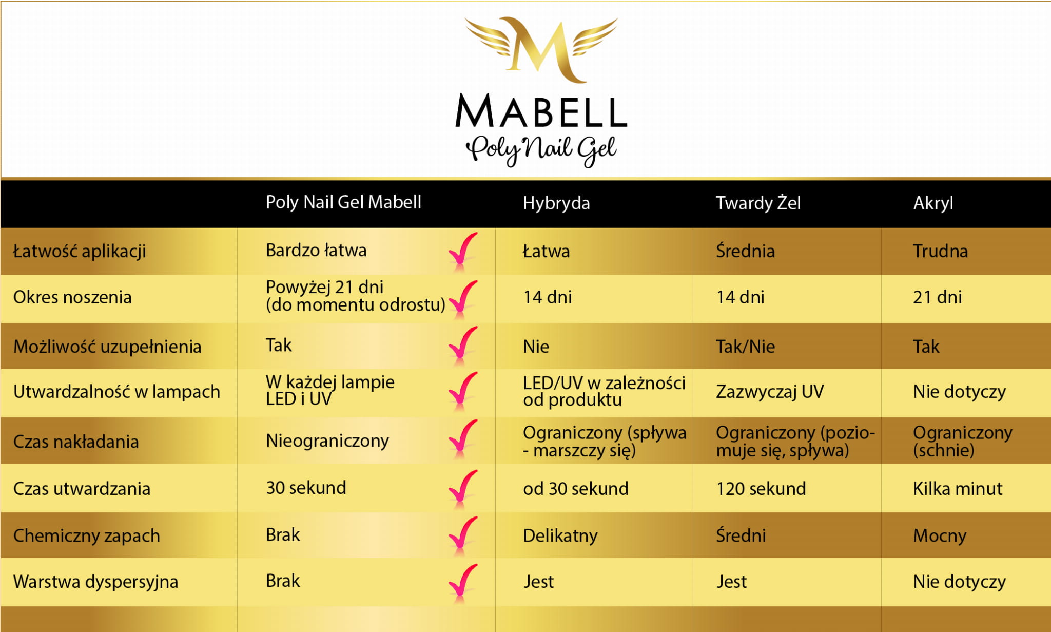 Przygotuj odpowiednio płytkę paznokcia i skórki. Użyj bloczku lub polerki do zmatowienia i odtłuść płytkę Mabell Poly Nail Gel First Step Nałoż Mabell Poly Nail Gel Base i utwardź w lampie. Wyciśnij z tubki niewielką ilość produktu i za pomocą kopytka lub specjalnej szpatułki nałóż na paznokieć. Uformuj pędzelkiem pożądany kształt szkieletu, jeśli żel zacznie się lepić zamocz pędzelek w Poly Nail Liquid, utwardź w lampie. Nałóż drugą warstwę akrylożelu, rozprowadź na paznokciu i utwardź. Wyrównaj kształt pilnikiem. Następnie na Poly Nail Gel możesz położyć kolorowy żel, lakier hybrydowy lub wykonać french manicure.