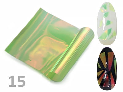 Opalizująca folia, odbijająca światło, dzięki której stworzysz wyjątkowe manicure. W zależności od koloru bazowego możliwe jest uzyskanie różnych efektów. Na jasnych barwach folia ma jasny zielony odcień, natomiast przy ciemnym podkładzie dostaje złotego blasku..