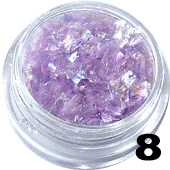 Transparentna, odbijająca światło folia w fioletowym odcieniu, dzięki której uzyskasz wyjątkowy efekt. Jest drobno pocięta i po nałożeniu na paznokcie przypomina stłuczone szkło, rozbite lustro. Dodatkowo cudownie mieni się w promieniach słonecznych dodając niezwykłego blasku stylizacji. W zależności od użytego koloru bazowego możliwe jest uzyskanie delikatnego jak i bardziej wyrazistego zdobienia.