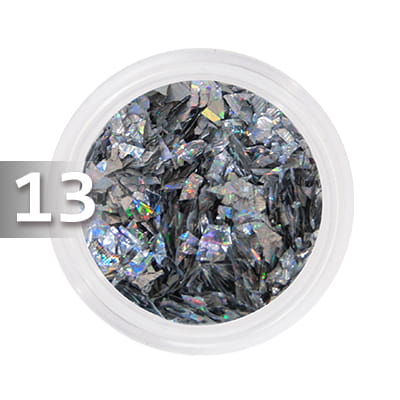 Odbijająca światło folia w kolorze srebrnym, dzięki której uzyskasz wyjątkowy efekt. Jest drobno pocięta i po nałożeniu na paznokcie przypomina stłuczone szkło, rozbite lustro. Dodatkowo cudownie mieni się w promieniach słonecznych na wszystkie kolory tęczy dodając niezwykłego blasku stylizacji.