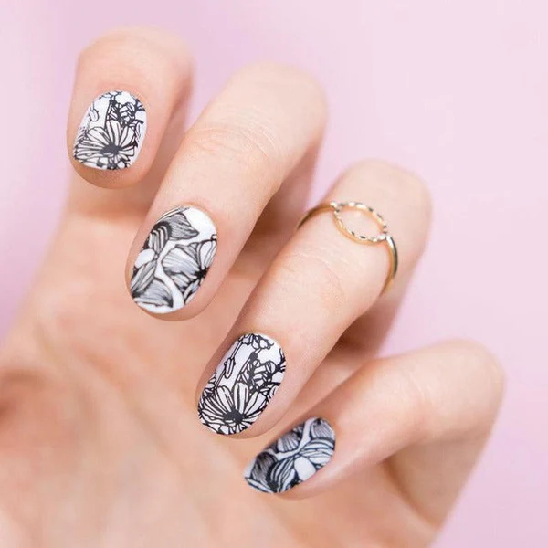 Opakowanie stanowi elegancki kartonik do przechowywania płytki. Wymiary płytki 6,5 x 12,5 cm. Płytka stanowi jeden duży format (10,5 x 4,7 cm) zawierający różne, mniejsze i zmysłowe wzory, które zapewnią paznokciom elegancką oraz charakterystyczną stylizację. Kolor wzoru na paznokciach w zależności od koloru zastosowanego lakieru.