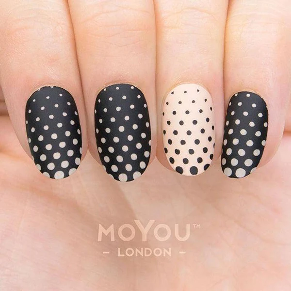 Opakowanie stanowi elegancki kartonik do przechowywania płytki. Wymiary płytki 6,5 x 12,5 cm. Płytka stanowi jeden duży format (10,5 x 4,7 cm) zawierający różne, mniejsze i zmysłowe wzory, które zapewnią paznokciom elegancką oraz charakterystyczną stylizację. Kolor wzoru na paznokciach w zależności od koloru zastosowanego lakieru.
