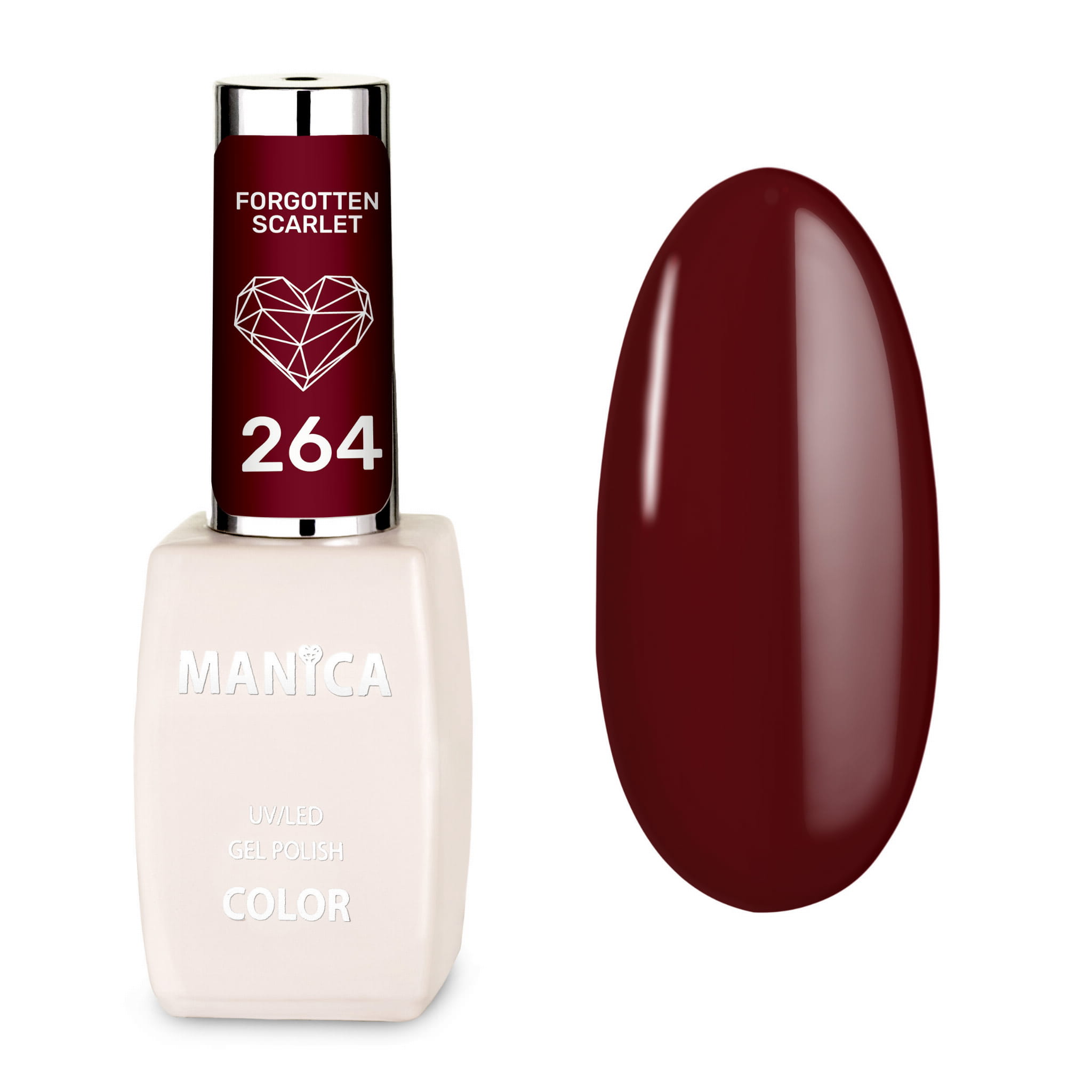 Niech Manica Lakier hybrydowy LED/UV - Forgotten Scarlet - 264 stanie się Twoim sekretem pięknego i trwałego manicure, łącząc elegancję z tajemniczą głębią.
