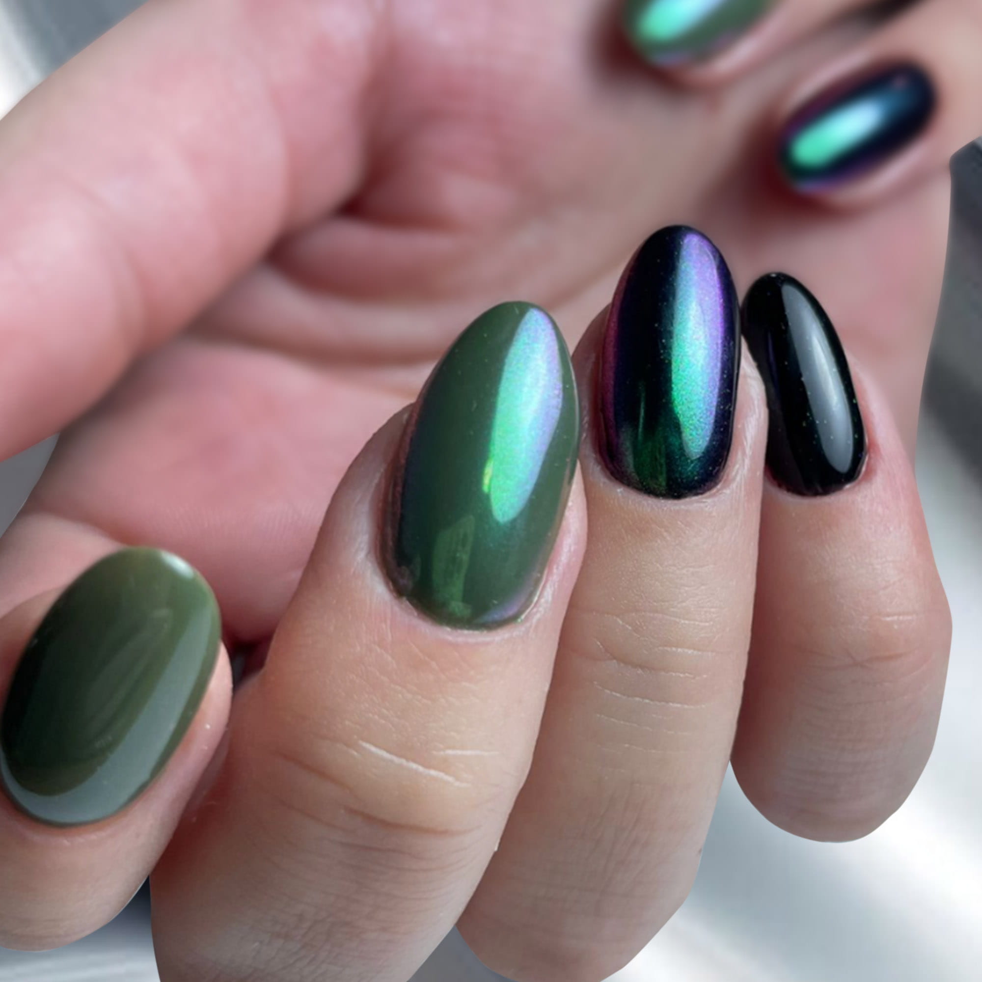 Natomiast na czarnym lakierze zmienia się w zieloną , błyszczącą taflę, która na brzegach przybiera fioletowo różowy odcień.