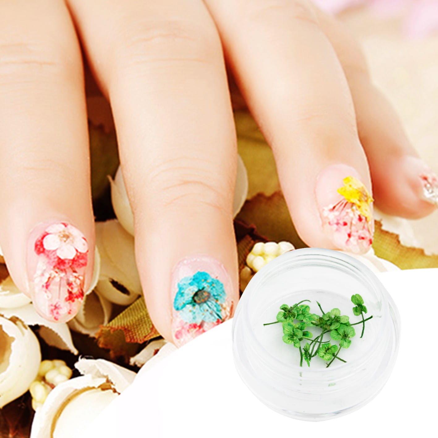 Maleńkie kwiatuszki z łodyżką w zielony kolorze, które dodadzą uroku i wprowadzą wiosenną radość na paznokciach. Są niezwykle delikatne dlatego nadają się do codziennej stylizacji, ale przy odrobinie fantazji będą wspaniałym dodatkiem na szczególne okazje. To naturalne kwiaty, które są powoli zasuszane by mogły zachować swój piękny kolor i mniej się kruszyły. Dzięki temu uzyskany efekt jest bardzo estetyczny i wyrafinowany. Można je również połączyć z syrenką, folią Broken Mirror, cyrkoniami dla jeszcze bardziej zdumiewającego rezultatu. Idealne do stylu Milky Bath Nail.