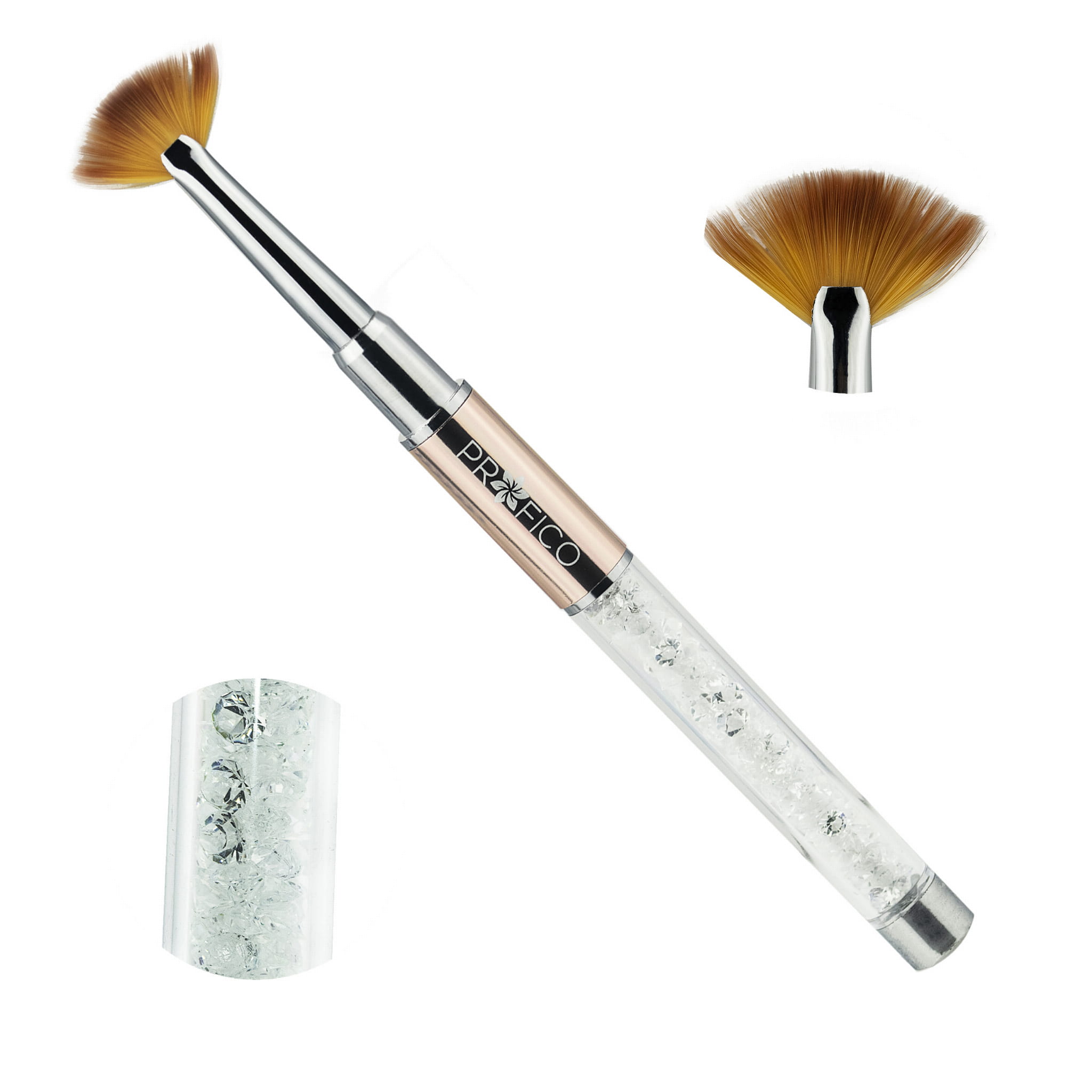 Pędzelek w kształcie wachlarza sprawdzającym się w manicure oraz makijażu. Wykonany został z syntetycznego, miękkiego włosia, które nie wywołuje podrażnień. Jego główny zastosowaniem jest aplikacja sypkich ozdób i usuwanie ich nadmiaru. Znakomicie również zastąpi szczoteczkę podczas zabiegu manicure. Jego długie, cienkie włosie dotrze w trudno dostępne miejsca doskonale oczyszczając płytkę z pyłu powstałego podczas piłowania.