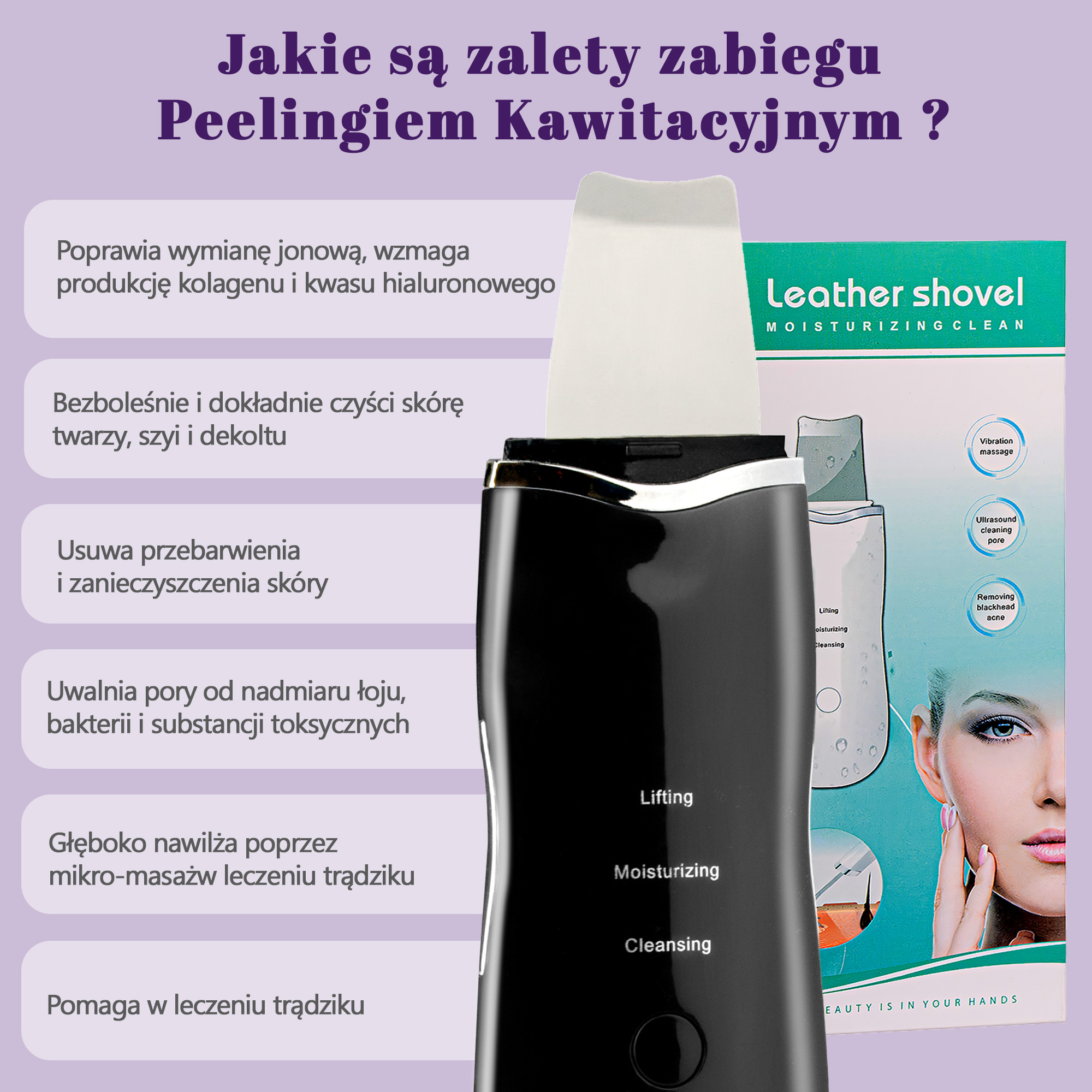 Peeling kawitacyjny 5w1 to praktyczne urządzenie do codziennej pielęgnacji, które wykorzystuje technologię ultradźwięków 28 kHz, aby wspierać oczyszczanie skóry i poprawę jej wyglądu. Regularne stosowanie pomaga usuwać nadmiar sebum, zanieczyszczenia oraz martwy naskórek, pozostawiając cerę wyraźnie gładszą i świeższą.