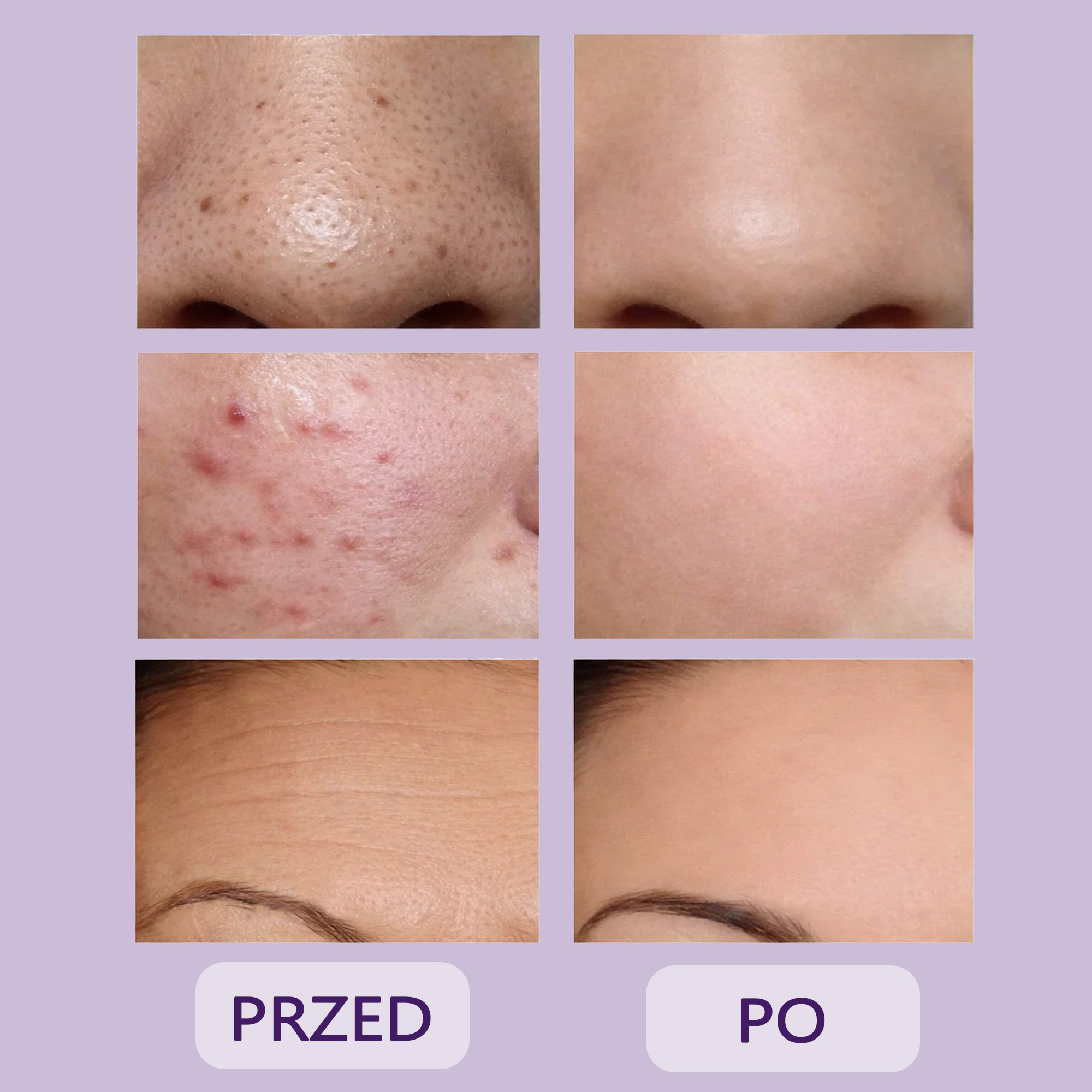 - Zmniejszenie widoczności porów przy regularnym stosowaniu