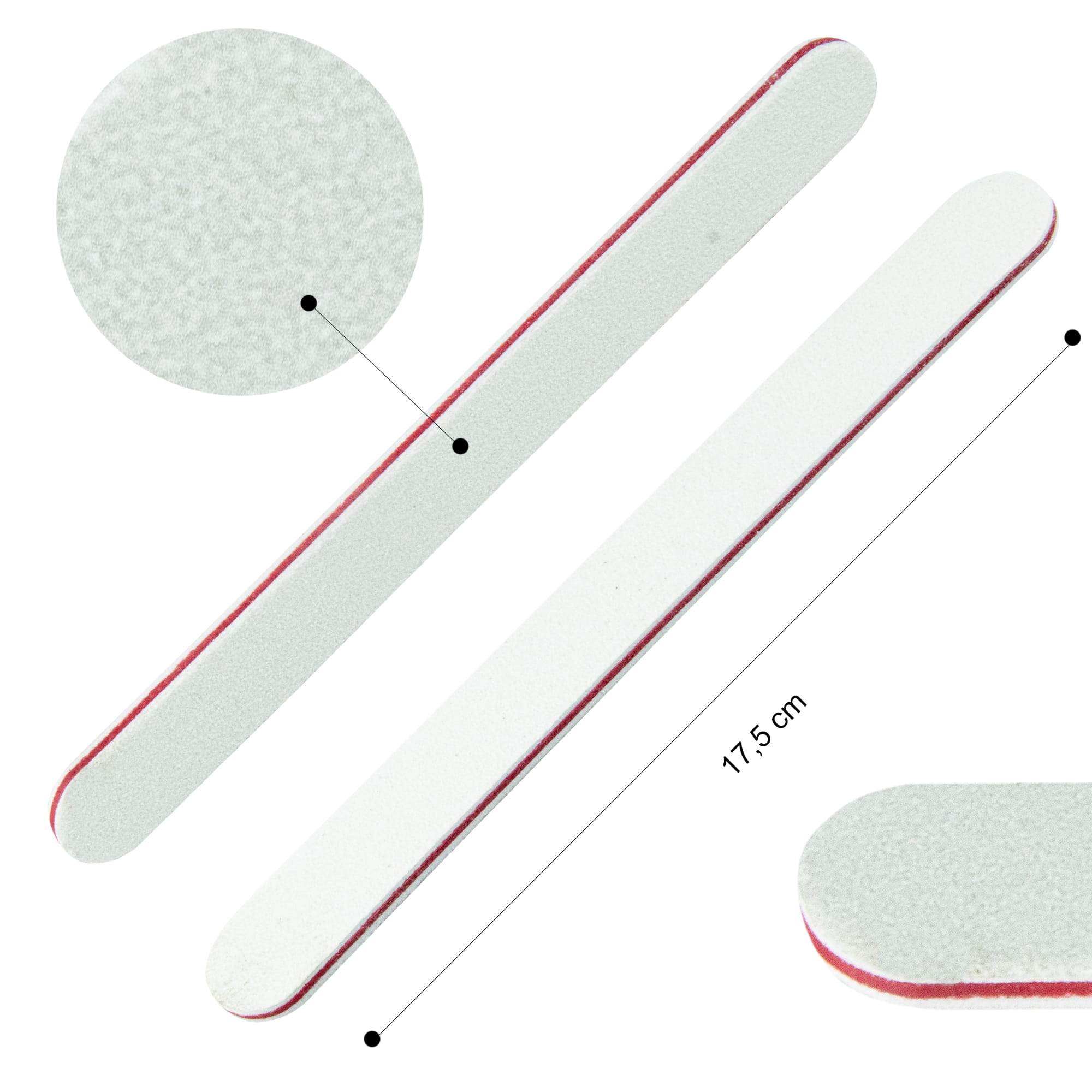 Dwustronny, prosty pilniczek do paznokci. Idealny do nadawaniu kształtu paznokciom oraz zmatowienia ich powierzchni przez wykonaniem manicure. Również do łatwego i bezpiecznego usuwania pozostałości manicure bez uszkodzenia płytki. Doskonale sprawdza się jednorazowo w salonie lub w codziennym, domowym użytkowaniu. Posiada wzmocniony środek zapobiegający łamaniu i wygięciom, a także papier podwyższonej jakości, co przedłuża jego trwałość.